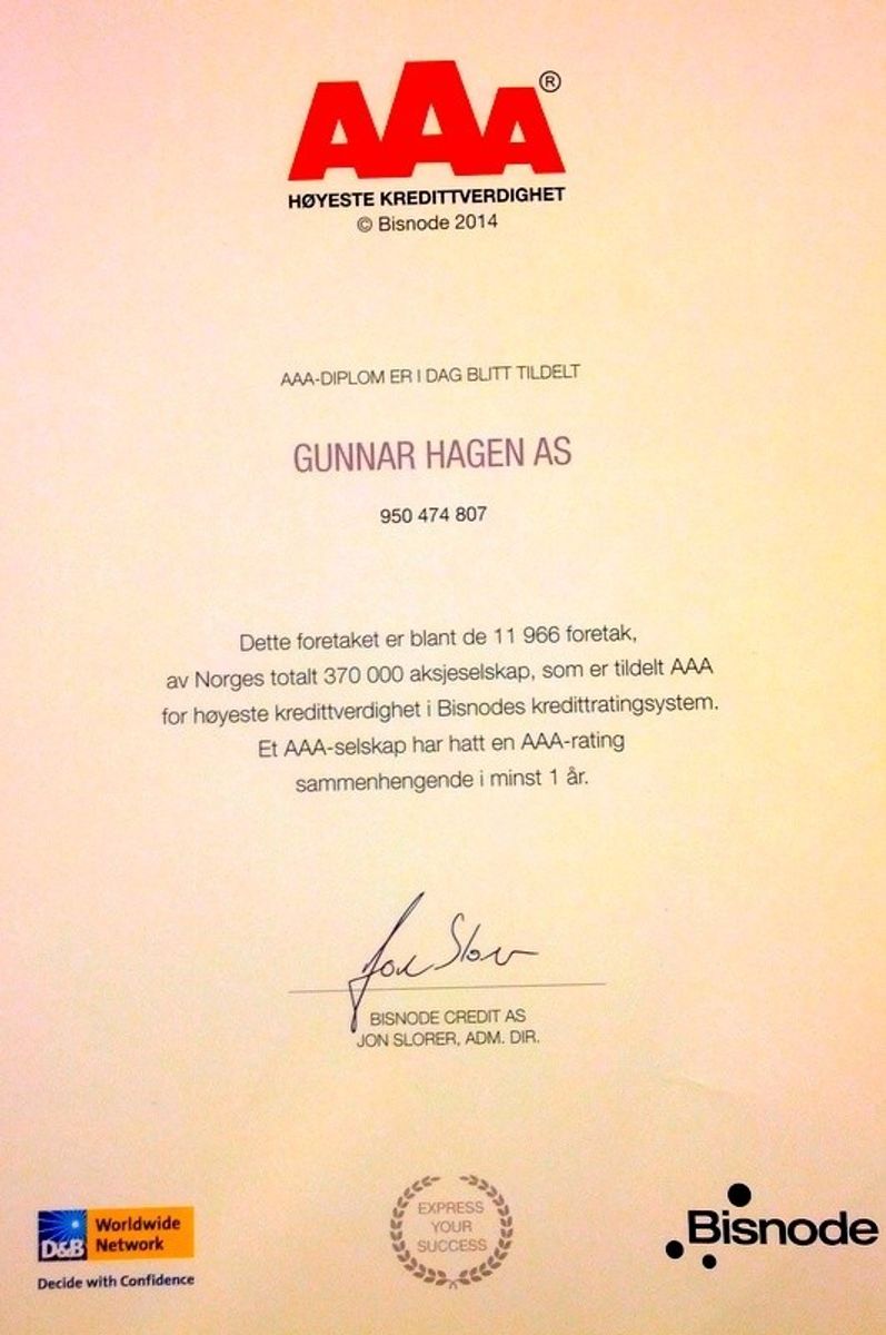 På mer enn 10 år har vi hatt AAA-rating og fikk derfor tildelt AAA-SØLV DIPLOM i 2016. Dette kvalitetsmerket står for høyeste kredittverdighet og økonomisk ryddighet. Det er vi meget stolte av.